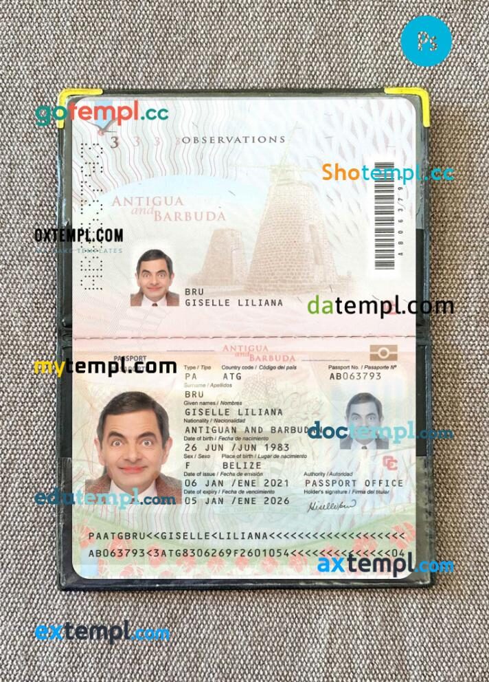 Antigua and Barbuda passport Photoshop template two in one with photo look and scan PSD files, which has a clean design and multi-functional solution.