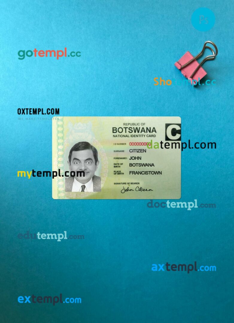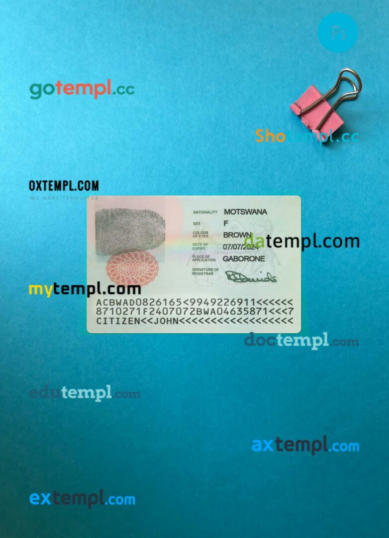 Our Botswana ID template offers two editable variants in one package: editable PSD files for both photo and scan looks. Compatible with Adobe Photoshop, this template is fully customizable, requiring only basic editing knowledge to personalize.