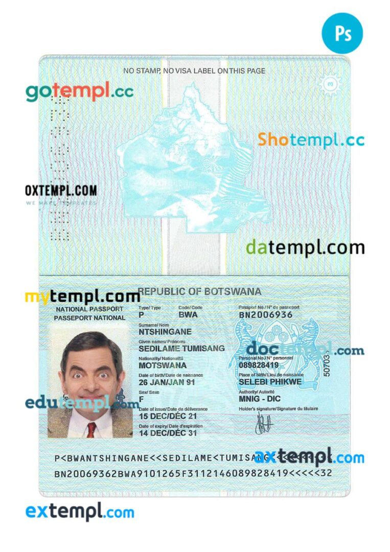 Fully editable template of Botswana passport. The template is in PSD format, high-quality and easy to fill.