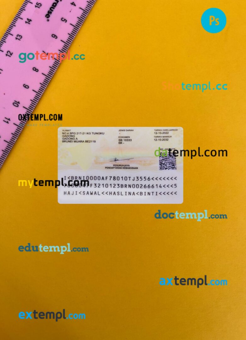 Our Brunei ID template offers two editable variants in one package: editable PSD files for both photo and scan looks. Compatible with Adobe Photoshop, this template is fully customizable, requiring only basic editing knowledge to personalize.