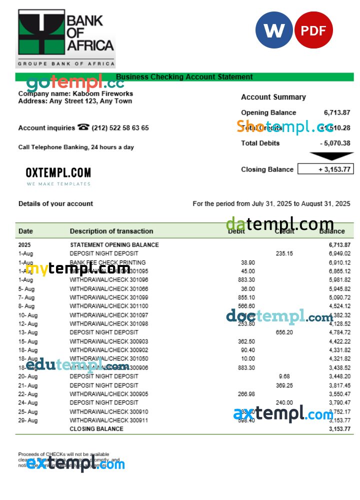 Completely editable bank company account statement template – to fill out your detailed information and business finances easily.