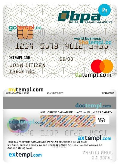 Cuba Banco popular de ahorro (bpa) bank world business mastercard PSD download template fully editable with the fonts