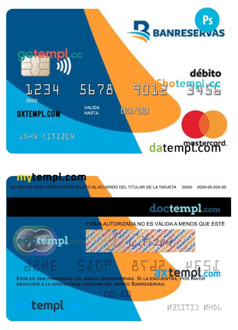 Dominican Republic Banreservas bank debit mastercard PSD download template fully editable with the fonts
