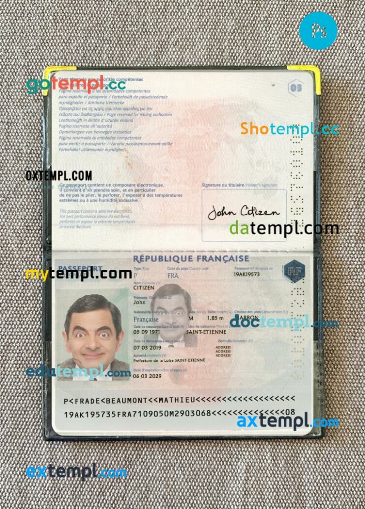 France passport editable PSD files with address page, scan and photo-realistic look, 2019-present