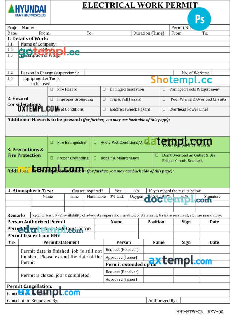 Fully editable Hyundai heavy industries electrical work permit template – easy to fill.