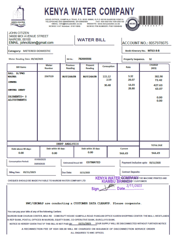 Fully editable Kenya Water Company utility bill sample in PSD format – easy to fill.