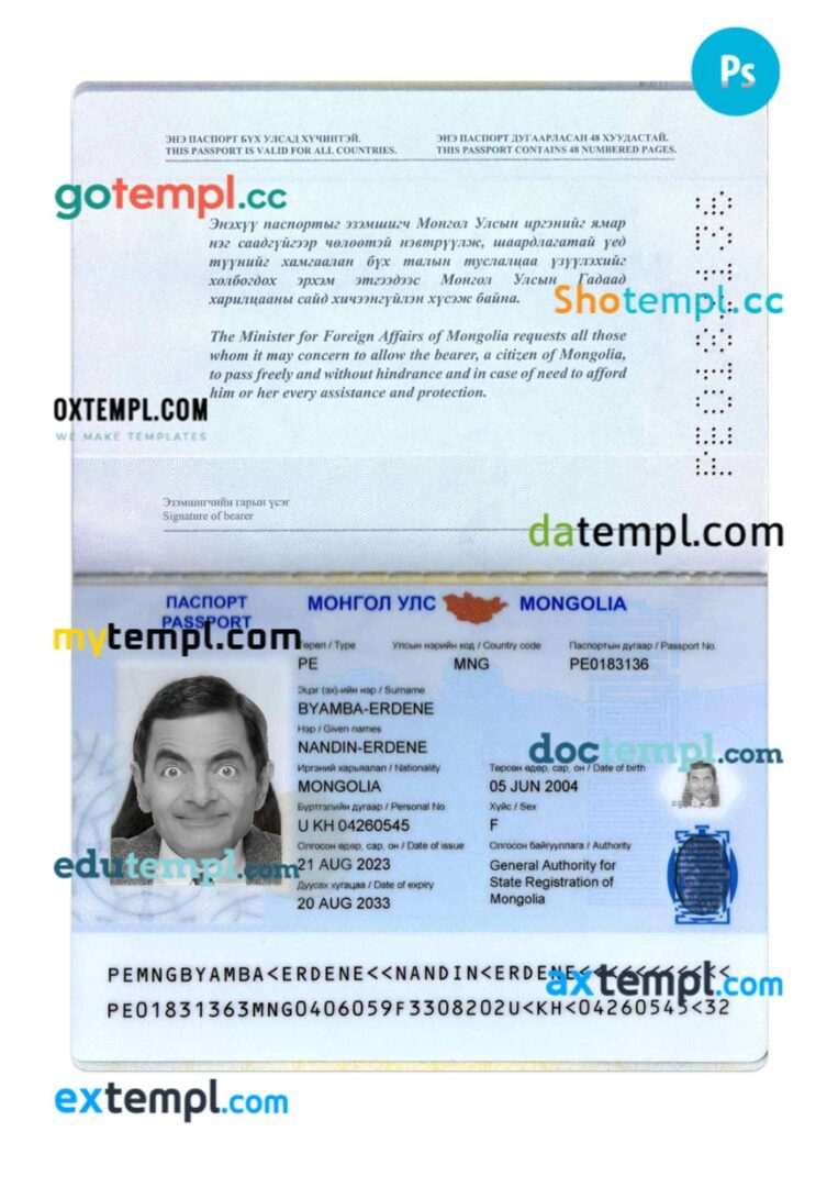 Fully editable template of Mongolia passport. The template is in PSD format, high-quality and easy to fill.