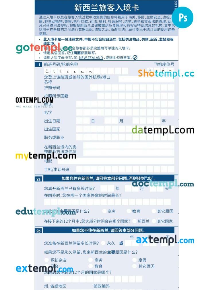 New Zealand arrival card template in PSD format, version 2