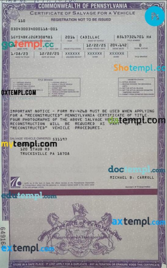 ○ title assignment section with buyer and seller’s names, addresses, date of sale, and signatures.
