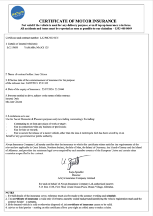 UK Lexham Insurance certificate of motor insurance Word and PDF template