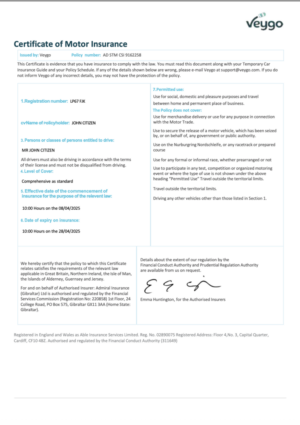 UK Victor Insurance certificate of motor insurance Word and PDF template