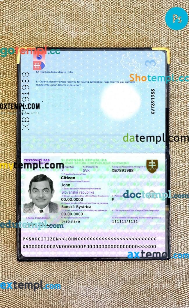 Slovakia passport editable PSD files with address page, scan and photo-realistic look, 2014-present