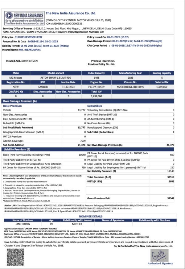 The New India Assurance certificate of insurance Word and PDF download template fully editable