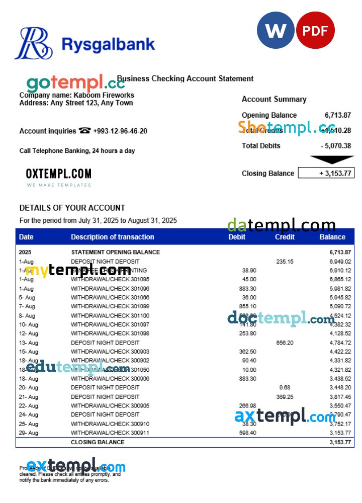 Turkmenistan Rysgal firm account statement Word and PDF template