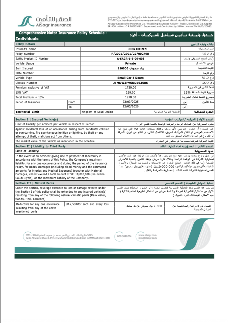 UAE Al Sagr Insurance comprehensive motor insurance policy schedule Word and PDF download template fully editable