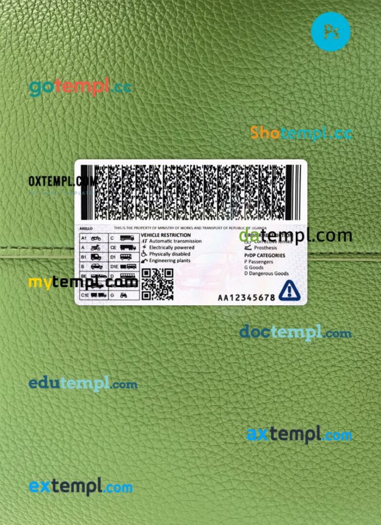 Our Uganda driving license template offers two options in one package: editable PSD files for both photo and scan looks. Compatible with Adobe Photoshop, this template is fully customizable, requiring only basic editing knowledge to personalize.