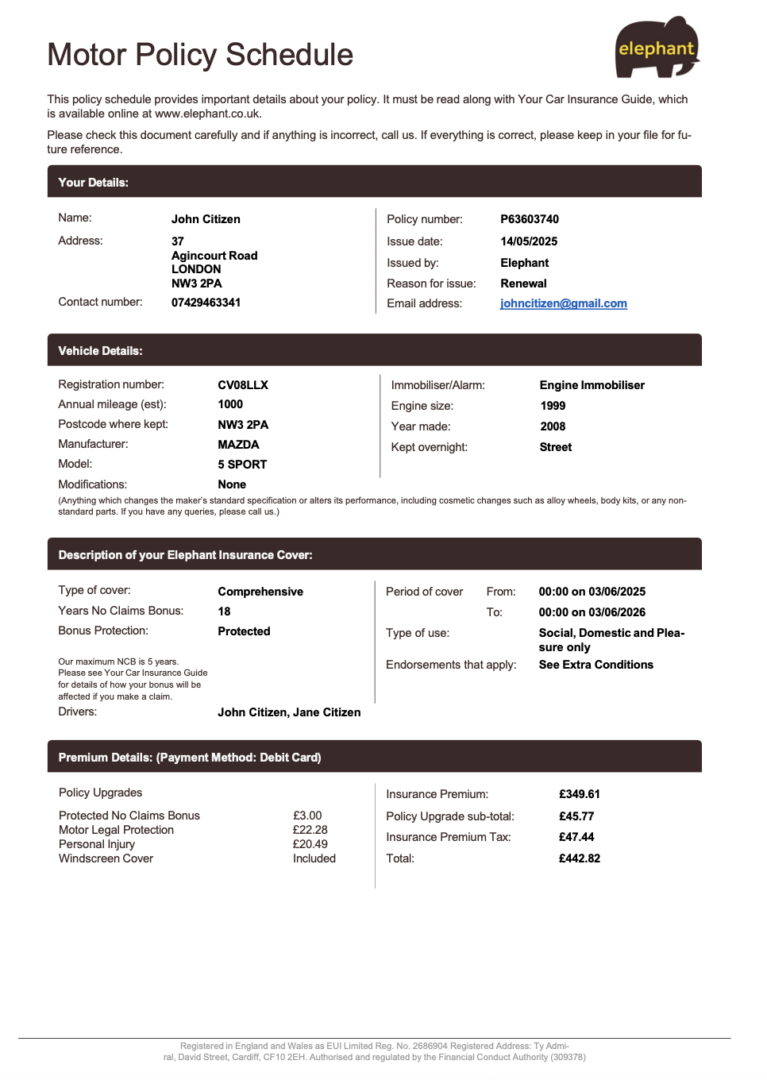UK Elephant Insurance motor policy schedule Word and PDF download template fully editable