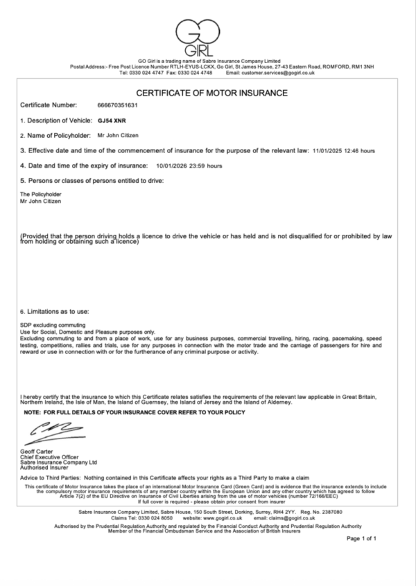 UK Sabre Insurance Company certificate of motor insurance Word and PDF download template fully editable