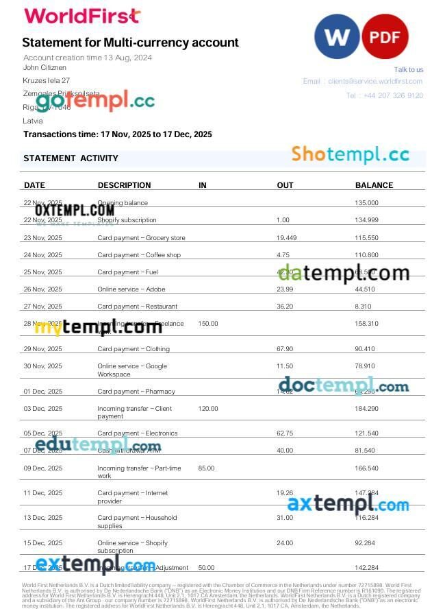 Like all our documents, this United Kingdom WorldFirst bank statement for Multi-currency account bank statement example is of high quality, which may be used as a proof of address in many sites.