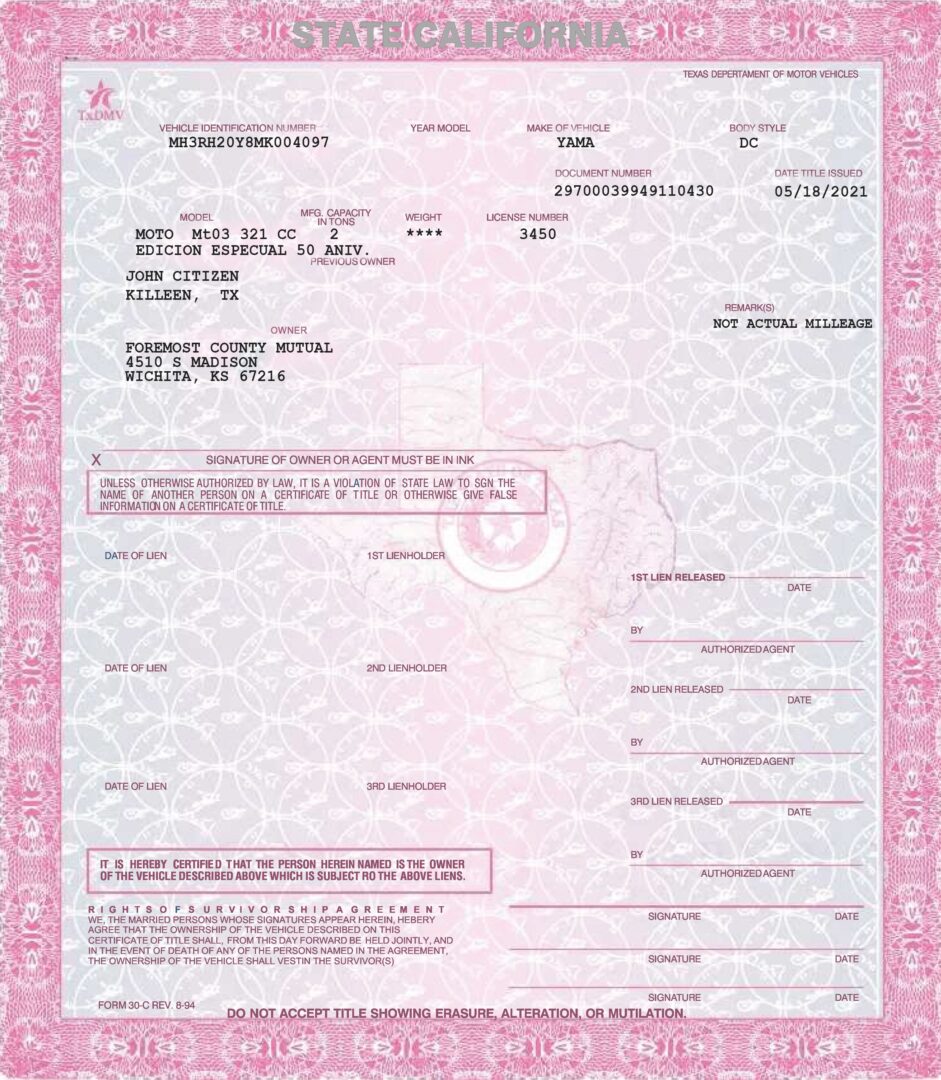 A car title shows who owns the vehicle.
