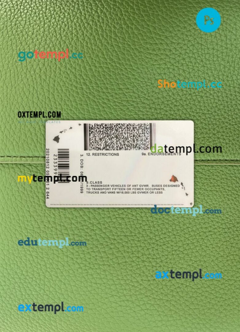 Our USA Hawaii driving license template offers two options in one package: editable PSD files for both photo and scan looks. Compatible with Adobe Photoshop, this template is fully customizable, requiring only basic editing knowledge to personalize.