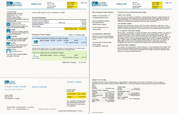 Fully editable USA LA DWP utility bill sample in PSD format – easy to fill.