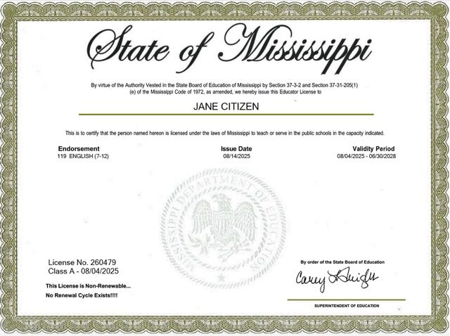 USA Mississippi educational license Word and PDF template
