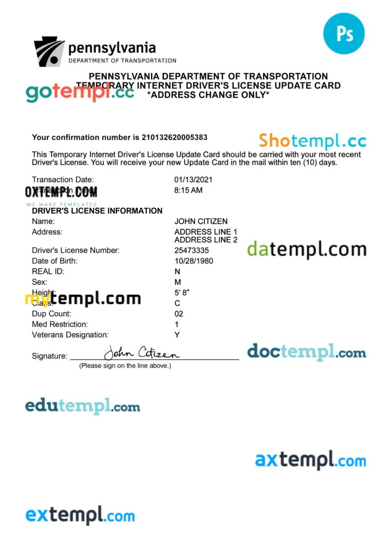 Here you see a high-quality temporary driving permit template of the State Pennsylvania.