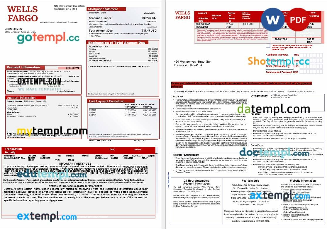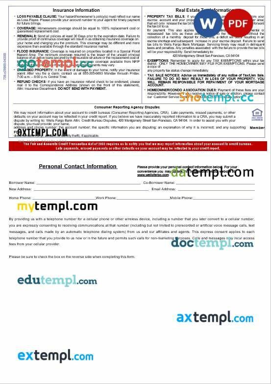 USA Wells Fargo bank mortgage statement in Word and PDF formats, 3 pages