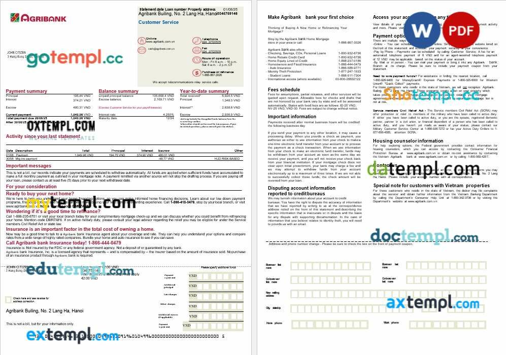 Vietnam Agribank bank mortgage statement in Word and PDF formats, 2 pages